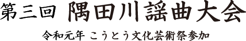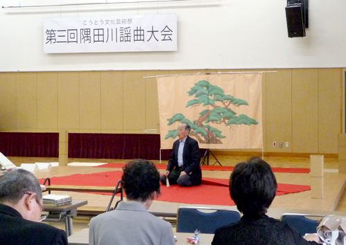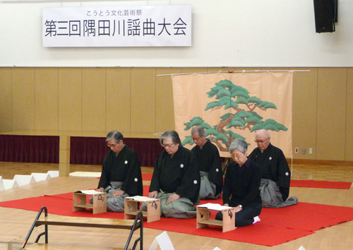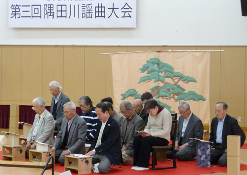 本謡曲大会は、隅田川両岸の謡曲愛好者の皆様が交流を深め、 合同で謡曲、仕舞を楽しもうと、平成29年開始しました。 第三回大会は江東区、中央区、墨田区、荒川区の皆様に加え、 遠くは藤沢市の皆様にもご参加いただき、盛況の内に幕を閉じました。